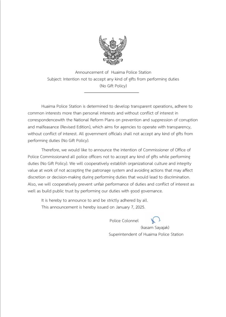 ประกาศ เจตนารมณ์ที่จะไม่รับของขวัญและของกำนัลทุกชนิดจากการปฏิบัติหน้าที่ (No Gift Policy)