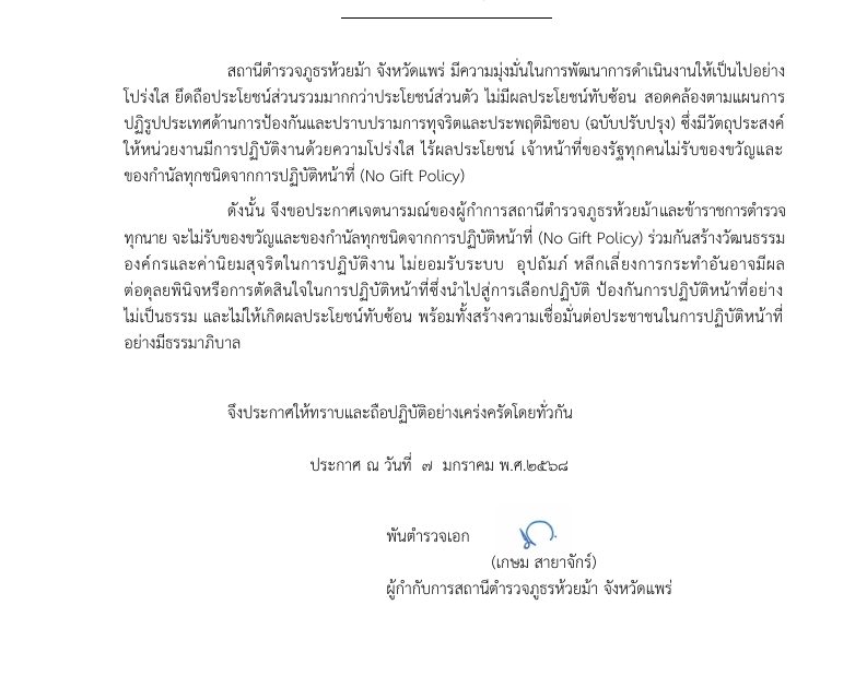 ประกาศ เจตนารมณ์ที่จะไม่รับของขวัญและของกำนัลทุกชนิดจากการปฏิบัติหน้าที่ (No Gift Policy)